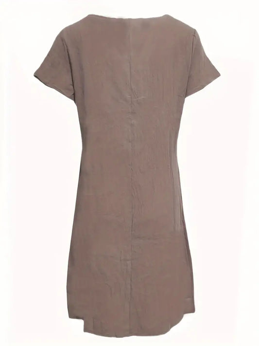 Loose Solid Short Sleeve Knee-Length Round Neck Pocket Dress